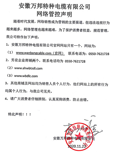 鄭重聲明:安徽萬邦特種電纜有限公司官方網站為:www_wanbangcable_com.hqdmgx.cn,除此之外無任何子網站或合作網站,其余均為假冒偽劣。電話:0550-7621728 13485756353 地 址:安徽省天長市滁州高新技術產業開發區經四路29號